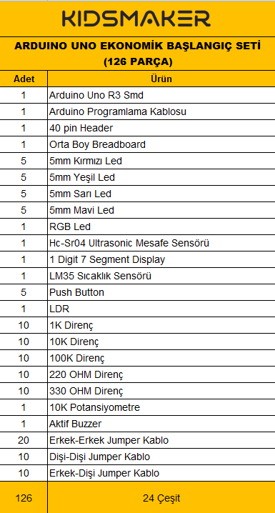 Arduino Ekonomik Başlangıç Seti 126 parçadır